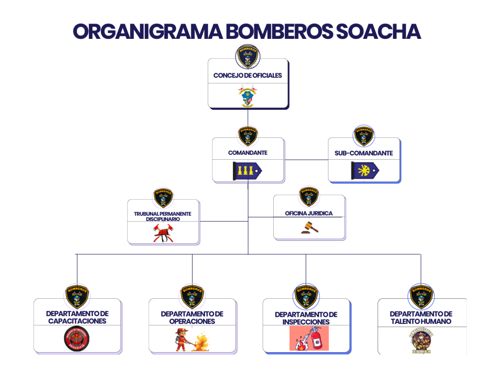 * Consejo de Oficiales: Máxima autoridad institucional: Encargado de la dirección general, la formulación de políticas, la aprobación de planes, presupuestos, reglamentos internos y la supervisión del cumplimiento misional del Cuerpo de Bomberos Voluntarios de Soacha.